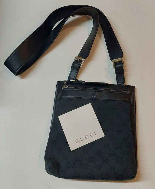詳細を全部見るA black shoulder bag with the GUCCI logo pattern. It features a strap and zippered compartment.- Brand: GUCCI- Color: Black- Material: Canvas/Leath...